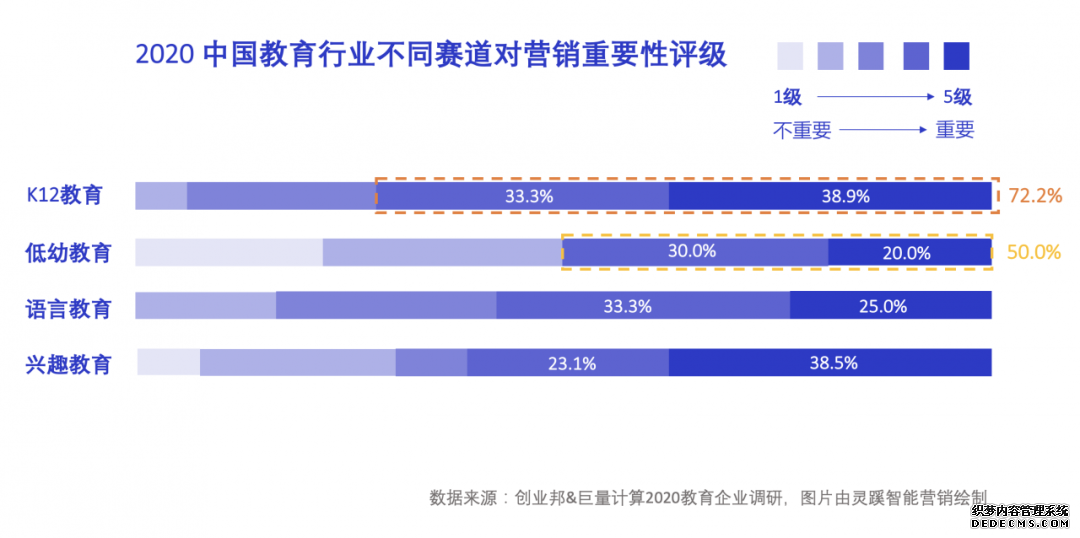 进一步细分,从不同赛道来看对营销战略的重视程度,“K12教育” 是最为重视营销投入的赛道,而 “低幼教育” 是相对在营销环节投入最少的赛道。