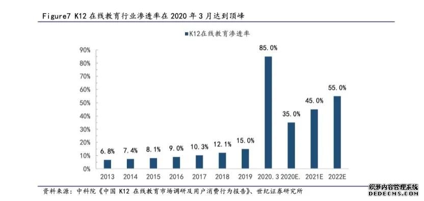 据中科院报告,K12在线教育行业渗透今年3月达到顶峰,为85%,并预测到2022年将突破55%。