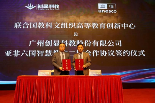 喜事连连,在当日活动上,创显科教还与联合国教科文组织高等教育创新中心(下称“创新中心”)共同就亚非六国智慧教室二期合作协议举行隆重的签约仪式。